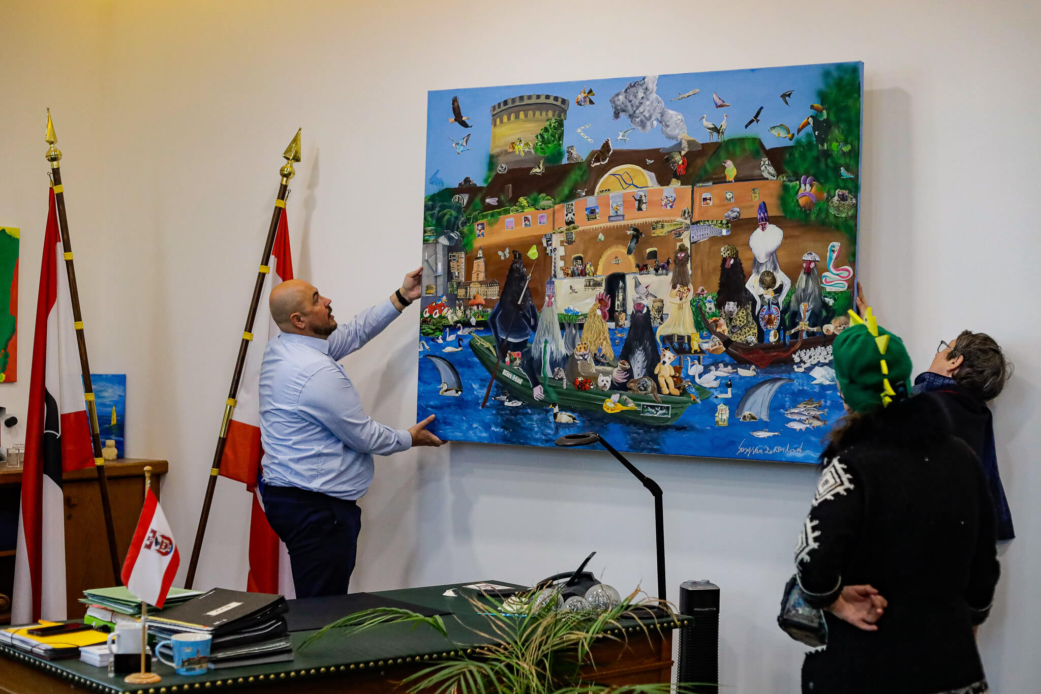 Ein Kunstwerk aus der Kunstwerkstatt von Mosaik zieht ins Rathaus Spandau ein: Mit der offiziellen Übergabe am 13. April hat die Arbeit „Spandauer Allerlei“ von Suzy van Zehlendorf ihren festen Platz im Büro von Bezirksbürgermeister Frank Bewig erhalten. Das Spandauer Kulturamt hat das Werk käuflich erworben.